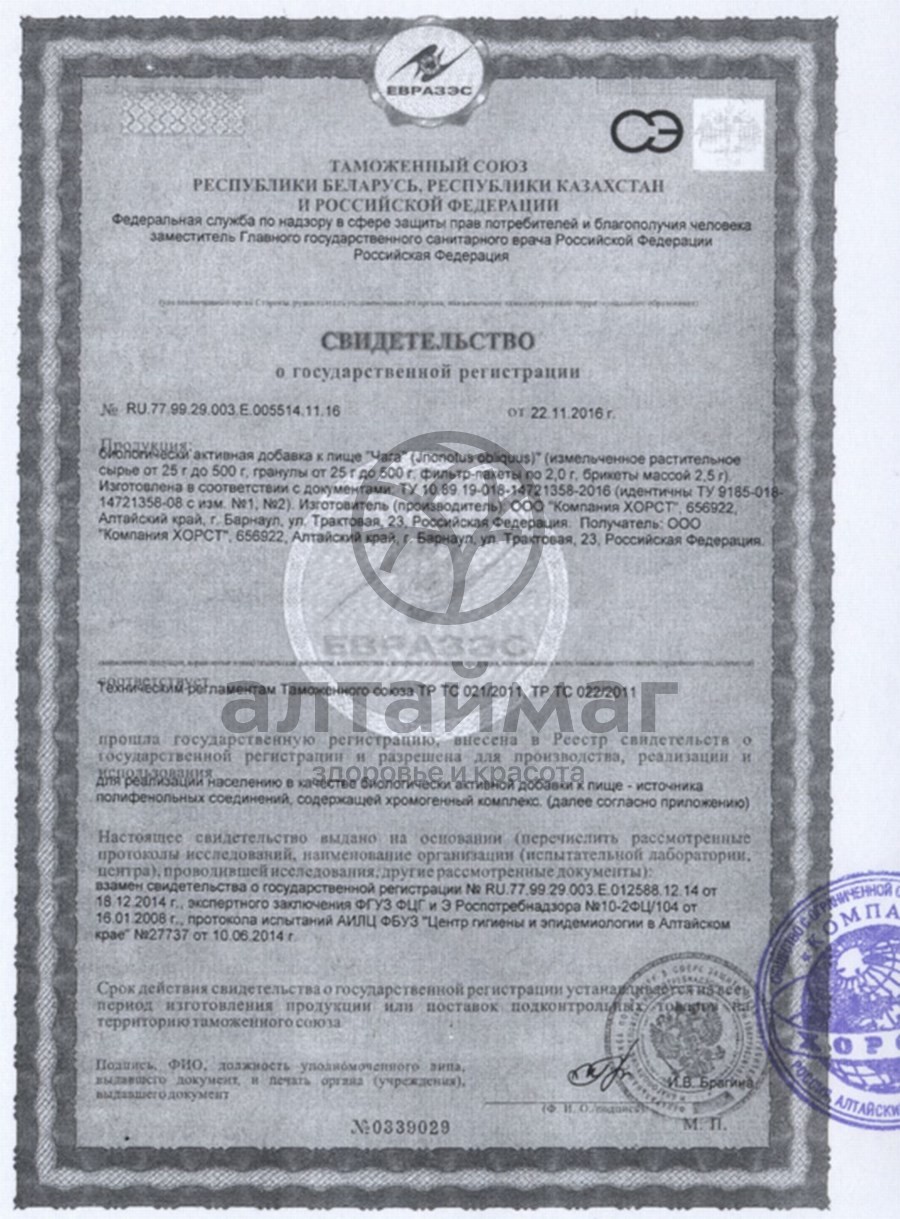 Рекомендуется в качестве источника полифенольных соединений, содержит хромогенный комплекс. Чага обладает свойствами: способствовать заживлению язвы двенадцатиперстной кишки, а также язвы желудка; положительным образом сказывается на работе нейрогуморальной и нервной системы нашего организма; чага обладает свойством улучшать работу желудочно-кишечного тракта; очень неплохо укрепляет иммунитет; обладает антибактериальными свойствами; вполне может использоваться как мочегонное средство; чага обладает свойством стабилизировать пульс и нормализует давление; оказывает влияние на дыхательную и сердечно-сосудистую систему; является противовоспалительным средством; чага обладает антивирусными, а также антигрибковыми свойствами; способствует заживлению ран различной степени тяжести; борется со злокачественными новообразованиями; чага уменьшает уровень сахара в крови.Масса нетто: