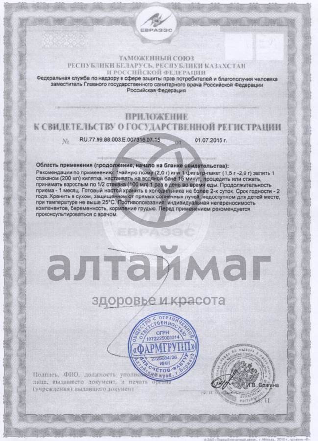 Взрослым по 1 фильтр-пакету (1,5 г-2,0 г) или 1 чайную ложку (2,0 г), залить 1 стаканом (200 мл) кипятка, настоять на водяной бане 15 минут, отжать или процедить, принимать по ½ стакана 1 раз в день во время еды. Готовый настой хранить в холодильнике не более 2-х суток. Продолжительность приема – 1 месяц.Противопоказания: