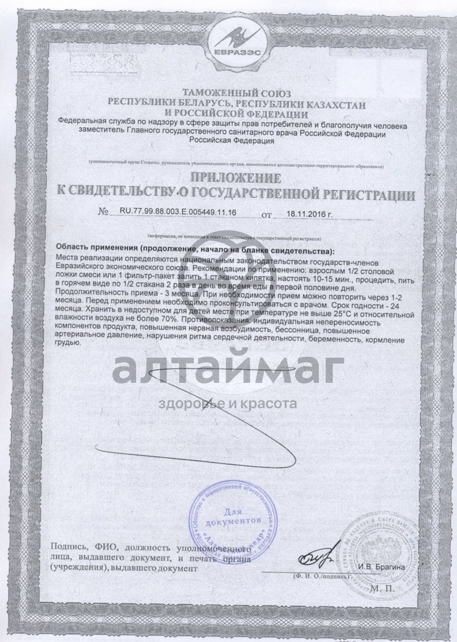 1 фильтр-пакет залить 1 стаканом кипятка, настоять 10-15 минут. Принимать напиток в горячем виде по 1/2 стакана 2 раза в день во время еды, в первой половине дня. Продолжительность приема – 3 месяца. При необходимости прием можно повторить через 1-2 месяца.