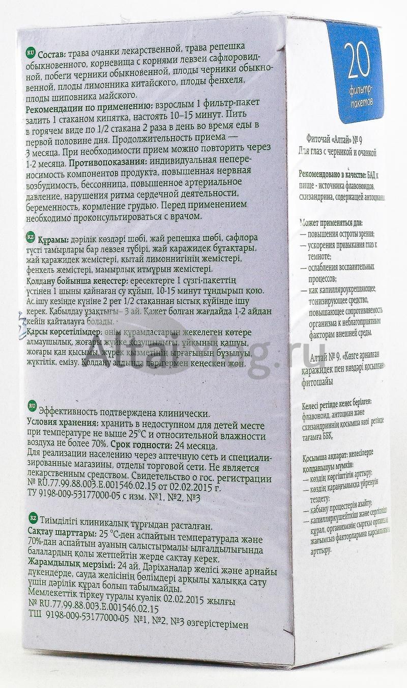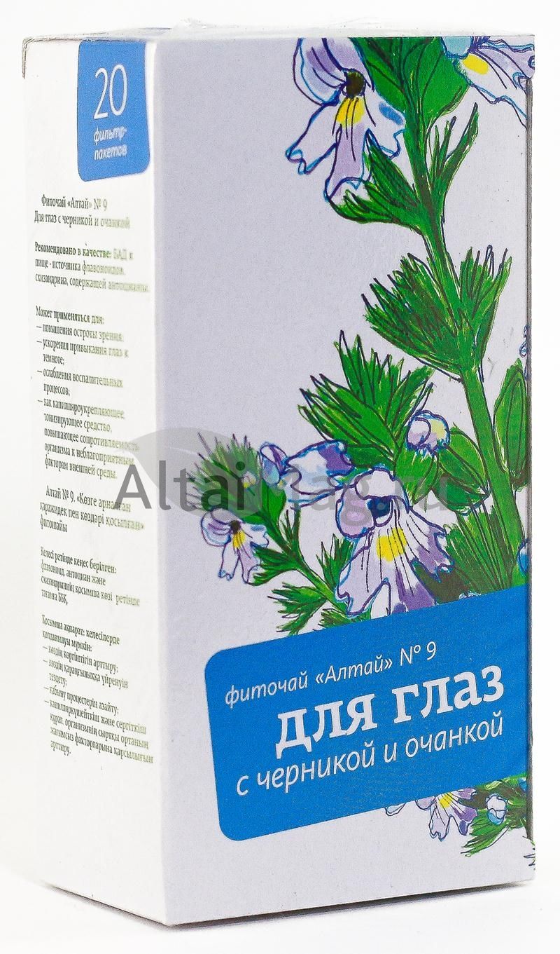 - Чтобы купить Фиточай Алтай №9 для глаз, 20 пакетиков совершите всего несколько шагов: укажите количество продукта и нажмите на кнопку «Купить».