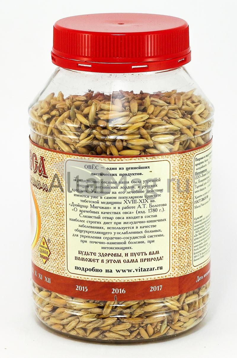 Зерно овса обладает высокой биологической активностью, оно богато белками, витаминами группы В, РР, Е, Д, ферментами, макро- и микроэлементами (кальций, кремний, магний, фосфор, железо, марганец, цинк). Зерно овса также содержит полисахарид-глюкан, обладающий способностью снижения холестерина в крови. Указания на лечебные свойства овса имеются в популярном трактате тибетской медицины восемнадцатого века Дзэйцхар Мигчхан, в работе А.Т.Болотова "О врачебных качествах овса". Отвары зёрен овса, кисели входят в состав диет при желудочно-кишечных и почечно-каменных заболеваниях, используются для очистки печени, при интоксикациях. Известны их успокаивающее, мочегонное и желчегонное действие. Издревле в народной медицине отвары зёрен овса употреблялись как профилактическое и общеукрепляющее средство. Овсяная каша является традиционной утреней пищей у многих народов. Предлагаемые зёрна овса вырабатываются из специально подобранных сортов данного злака и технологически подготовлены для использования в домашних условиях.